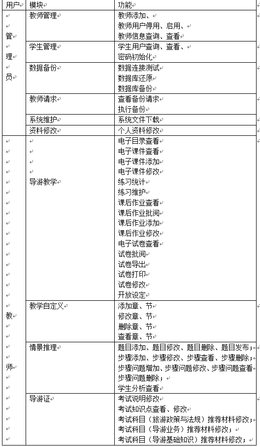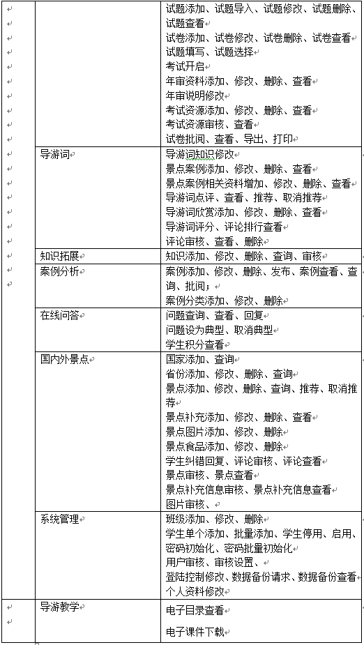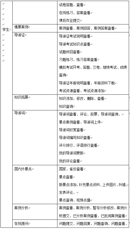 學(xue)(xue)生的(de)主要功能(neng)是導(dao)(dao)游教學(xue)(xue)知識的(de)學(xue)(xue)習(xi)(xi)(xi)、完成情景(jing)推理中包含(han)的(de)案例及題目、導(dao)(dao)游證(zheng)考試(shi)學(xue)(xue)習(xi)(xi)(xi)及模擬考試(shi)、導(dao)(dao)游拓展(zhan)知識學(xue)(xue)習(xi)(xi)(xi),同(tong)時可添加新(xin)的(de)知識供其他(ta)同(tong)學(xue)(xue)學(xue)(xue)習(xi)(xi)(xi)、導(dao)(dao)游詞學(xue)(xue)習(xi)(xi)(xi)并(bing)編寫導(dao)(dao)游詞、國內外景(jing)點學(xue)(xue)習(xi)(xi)(xi)、案例分析和在線(xian)提問(wen)。