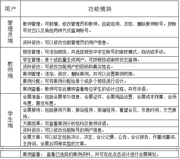 系統內置幾十條(tiao)國(guo)(guo)(guo)內外會展(zhan)案(an)例信(xin)息,包(bao)括柏林國(guo)(guo)(guo)際(ji)水(shui)果蔬菜博(bo)覽(lan)會、廣州國(guo)(guo)(guo)際(ji)節能展(zhan)覽(lan)會、華南國(guo)(guo)(guo)際(ji)名(ming)酒名(ming)茶展(zhan)覽(lan)會、中國(guo)(guo)(guo)環(huan)保(bao)博(bo)覽(lan)會、中國(guo)(guo)(guo)國(guo)(guo)(guo)際(ji)機電工業博(bo)覽(lan)會等。系統還提(ti)供開放式的案(an)例添加端口(kou),教師可按自己的授課方式添加最新的案(an)例。